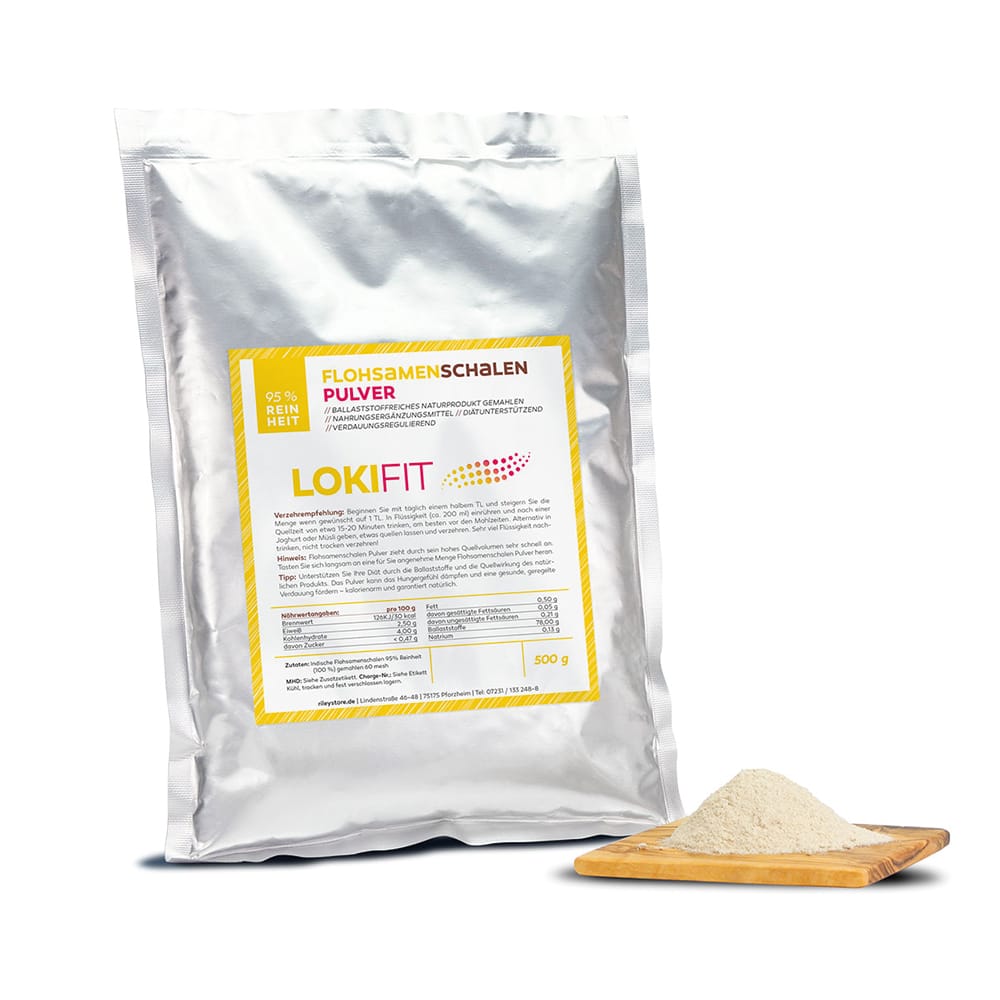 Inhaltsstoffe: 500 g Flohsamenschalenpulver im Alubeutel, 95 % Reinheit