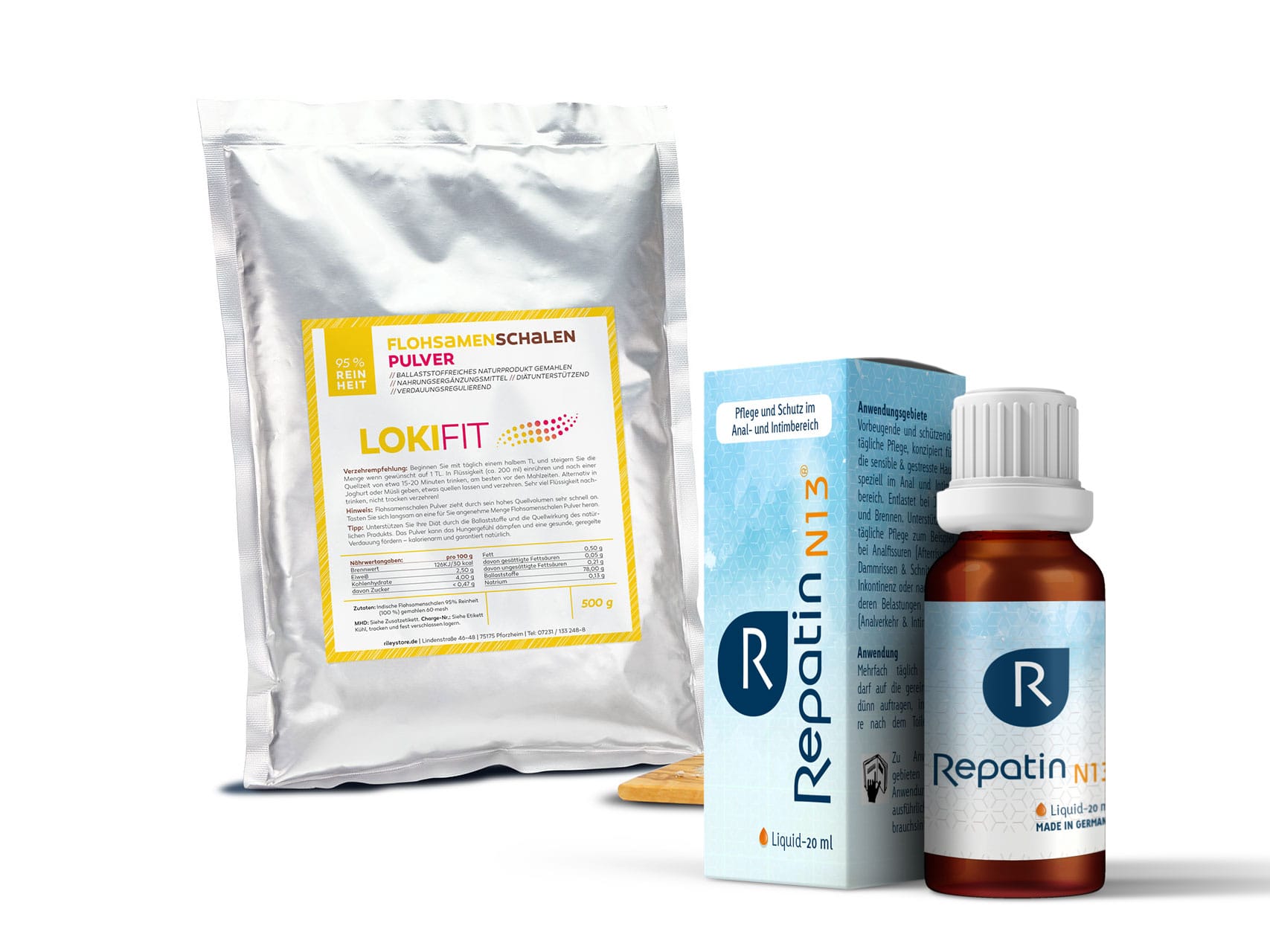 Unsere Bestseller im preisgünstigen Kombipack. Repatin N13 für Schutz und Pflege der Haut im Intim- und Analbereich und Flohsamenschalenpulver zur Unterstützung, damit das Wohlbefinden nicht durch zu harten Stuhlgang gefährdet wird.